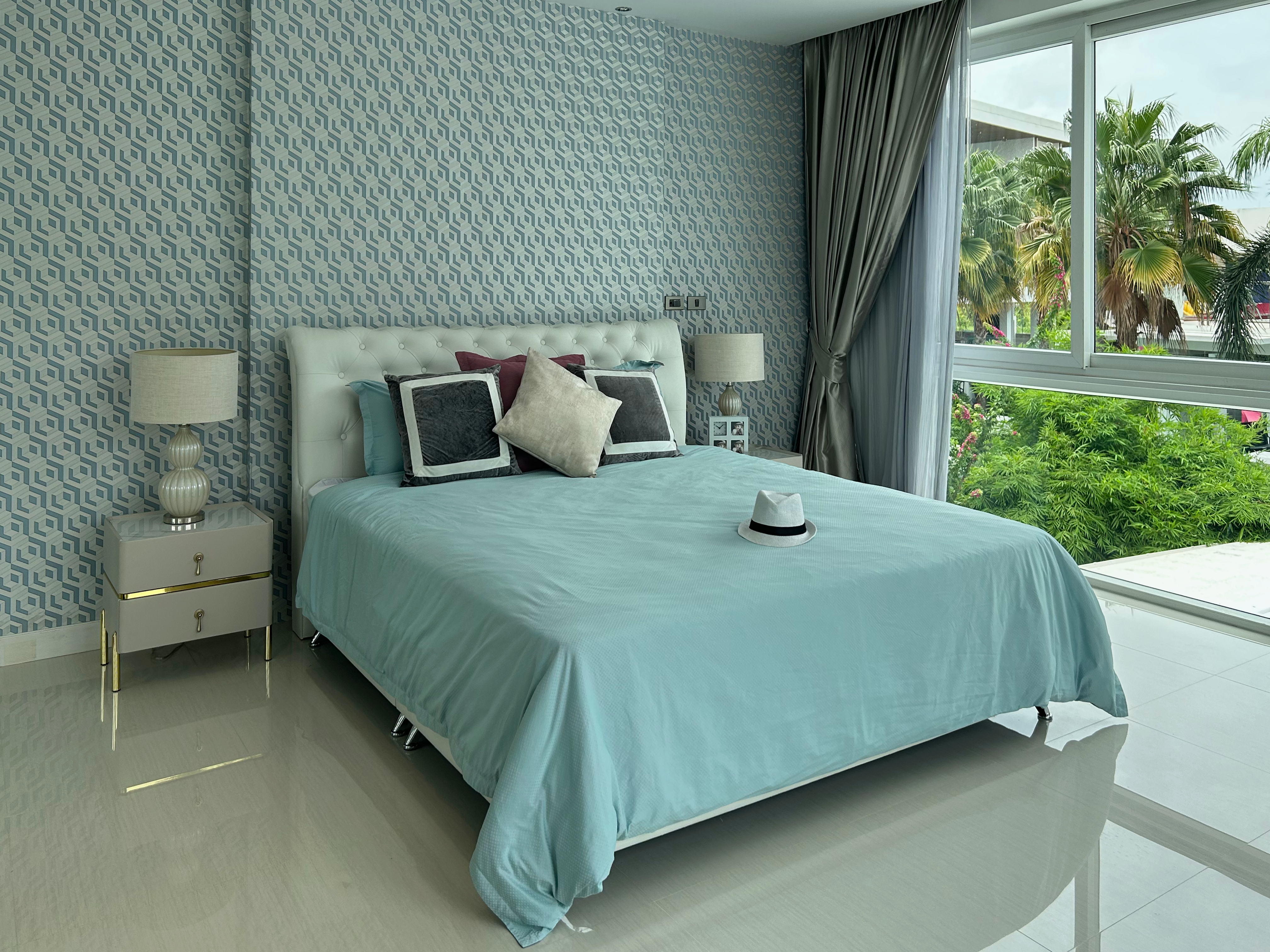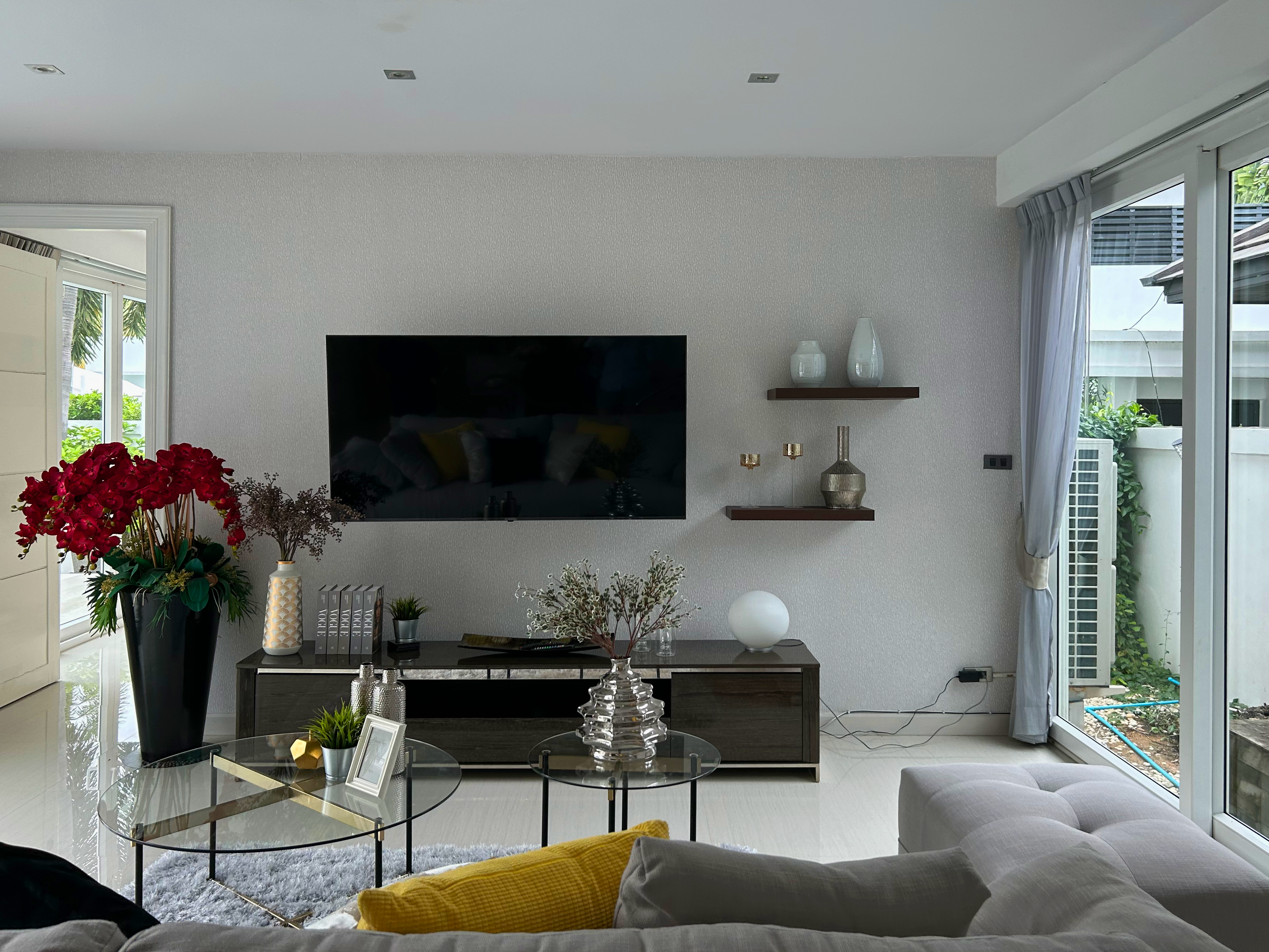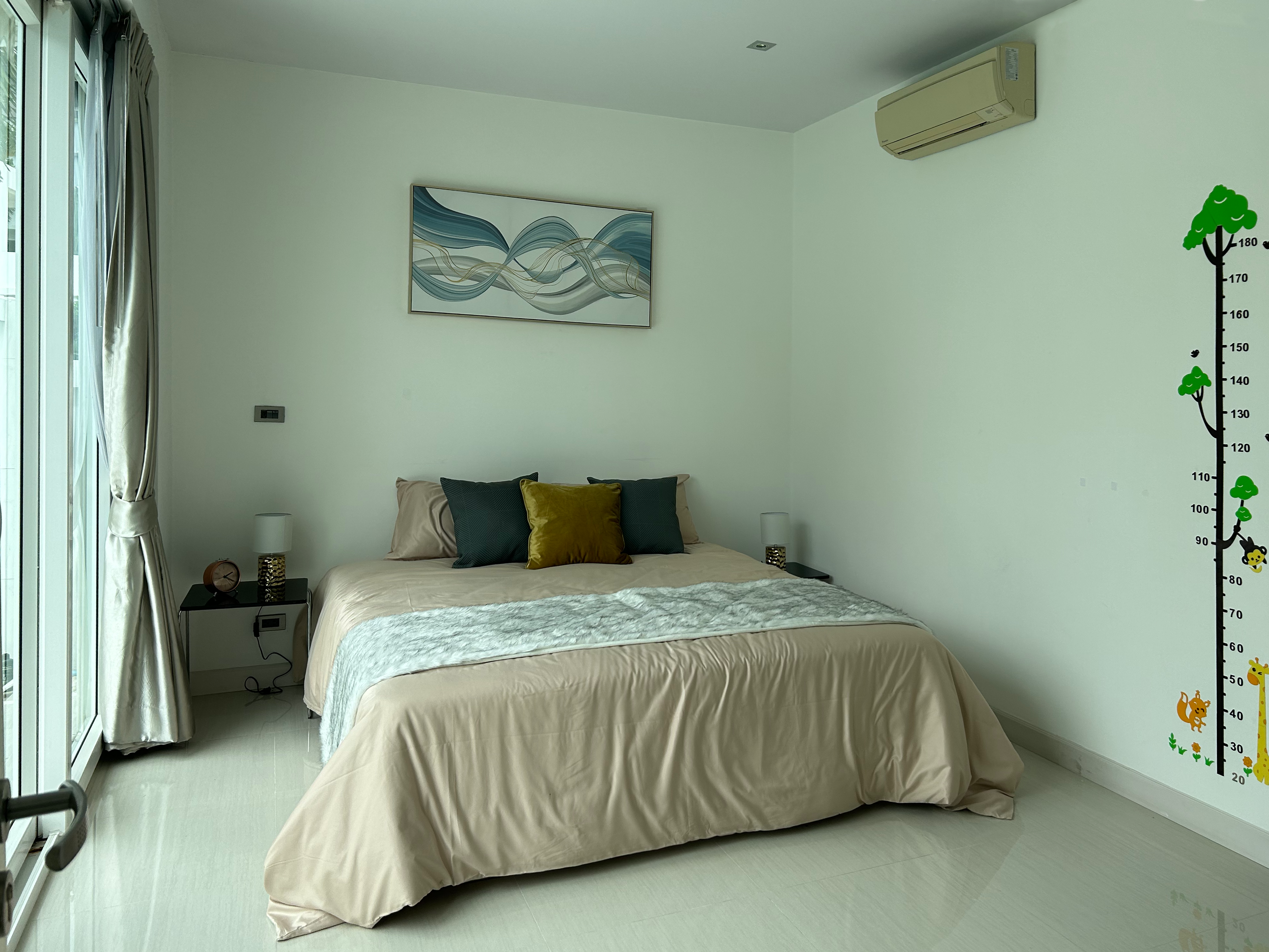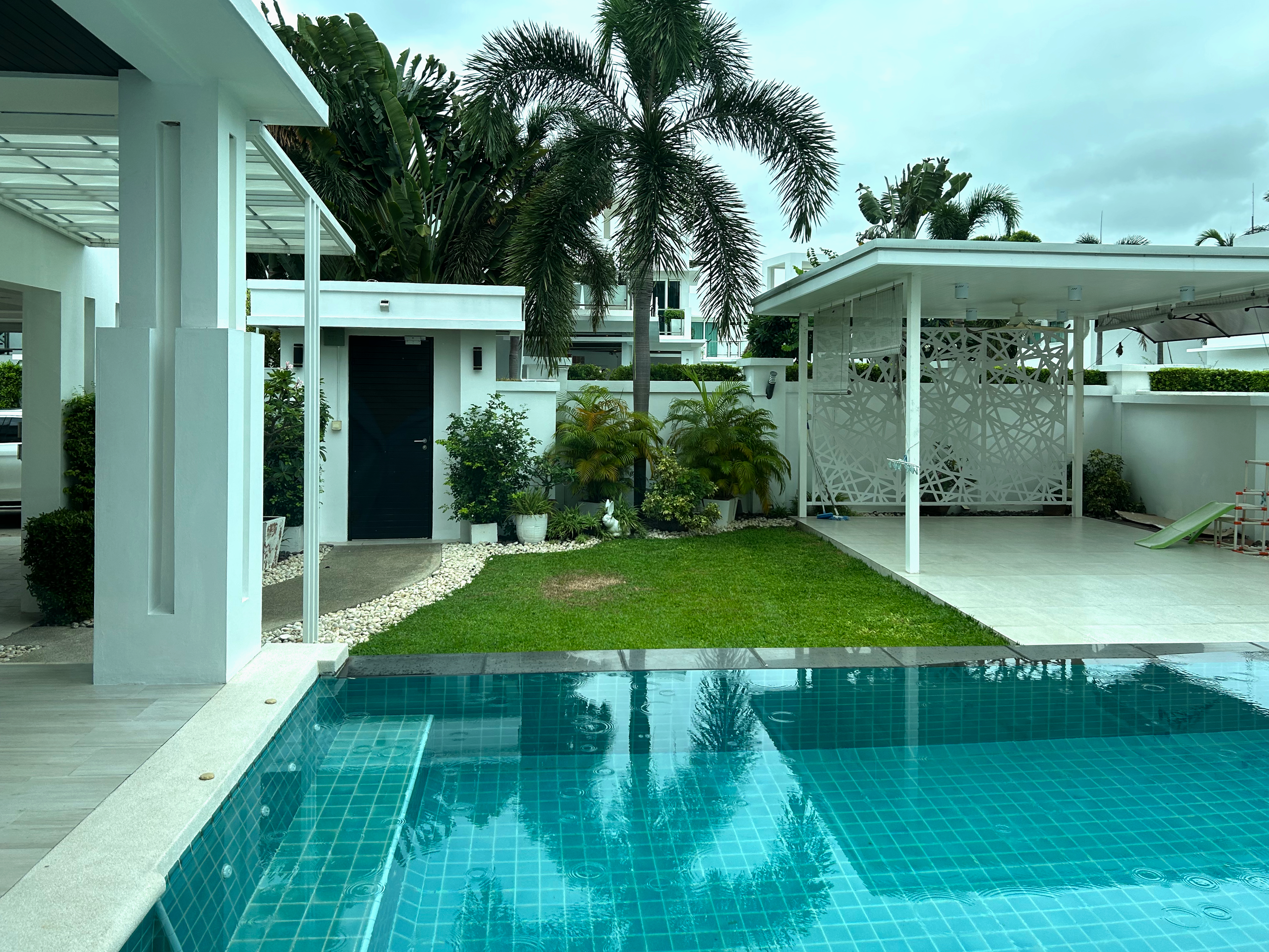A fully furnished, modern pool villa within a secure village in Jomtien. A 4 bedroom, 3 bathroom house with a salt water pool. Recently renovated 2 floors with a large rooftop perfect for evening lounging. With both Thai and European Kitchen with built-in furniture, oven, microwave, etc., and a spacey storage room. Fully equipped with security cameras, alarm systems and doorbell camera with 1 indoor parking spot available. Total area: 400m2, area of house: 200/m2.